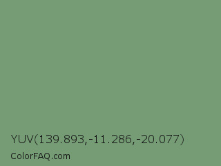 YUV 139.893,-11.286,-20.077 Color is a normal green color and the nearest color is Laurel #749378. Hex code #759c75 and RGB value is rgb(117,156,117). In RGB color space, this color is composed of 46% red, 61% green, 46% blue, In CMYK color space, this color is composed of 25% cyan, 0% magenta, 25% yellow , 39% black , In HSL color space, this color has a hue angle of 120° , 16% saturation and 54% lightness.
