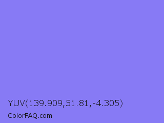 YUV 139.909,51.81,-4.305 Color is a light indigo color and the nearest color is Medium Slate Blue #7b68ee. Hex code #877af5 and RGB value is rgb(135,122,245). In RGB color space, this color is composed of 53% red, 48% green, 96% blue, In CMYK color space, this color is composed of 45% cyan, 50% magenta, 0% yellow , 4% black , In HSL color space, this color has a hue angle of 246° , 86% saturation and 72% lightness.