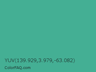 YUV 139.929,3.979,-63.082 Color is a normal cyan color and the nearest color is Mint #3eb489. Hex code #44af94 and RGB value is rgb(68,175,148). In RGB color space, this color is composed of 27% red, 69% green, 58% blue, In CMYK color space, this color is composed of 61% cyan, 0% magenta, 15% yellow , 31% black , In HSL color space, this color has a hue angle of 165° , 44% saturation and 48% lightness.