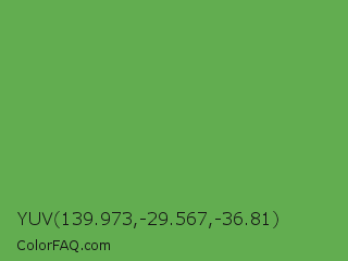 YUV 139.973,-29.567,-36.81 Color is a normal green color and the nearest color is Apple #4fa83d. Hex code #62ad50 and RGB value is rgb(98,173,80). In RGB color space, this color is composed of 38% red, 68% green, 31% blue, In CMYK color space, this color is composed of 43% cyan, 0% magenta, 54% yellow , 32% black , In HSL color space, this color has a hue angle of 108° , 37% saturation and 50% lightness.