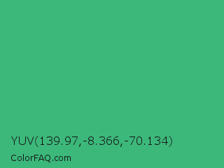 YUV 139.97,-8.366,-70.134 Color is a normal green color and the nearest color is Medium Sea Green #3cb371. Hex code #3cb87b and RGB value is rgb(60,184,123). In RGB color space, this color is composed of 24% red, 72% green, 48% blue, In CMYK color space, this color is composed of 67% cyan, 0% magenta, 33% yellow , 28% black , In HSL color space, this color has a hue angle of 150° , 51% saturation and 48% lightness.