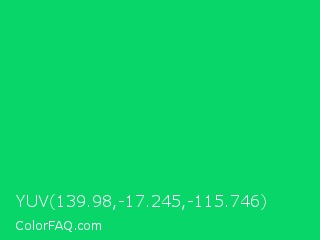 YUV 139.98,-17.245,-115.746 Color is a normal green color and the nearest color is Malachite #0bda51. Hex code #08d669 and RGB value is rgb(8,214,105). In RGB color space, this color is composed of 3% red, 84% green, 41% blue, In CMYK color space, this color is composed of 96% cyan, 0% magenta, 51% yellow , 16% black , In HSL color space, this color has a hue angle of 148° , 93% saturation and 44% lightness.