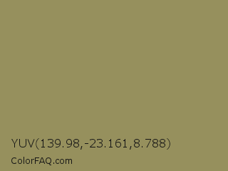 YUV 139.98,-23.161,8.788 Color is a normal yellow color and the nearest color is Moss Green #8a9a5b. Hex code #96905d and RGB value is rgb(150,144,93). In RGB color space, this color is composed of 59% red, 56% green, 36% blue, In CMYK color space, this color is composed of 0% cyan, 4% magenta, 38% yellow , 41% black , In HSL color space, this color has a hue angle of 54° , 23% saturation and 48% lightness.