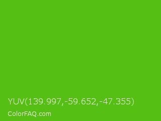 YUV 139.997,-59.652,-47.355 Color is a normal green color and the nearest color is Kelly Green #4cbb17. Hex code #56bf13 and RGB value is rgb(86,191,19). In RGB color space, this color is composed of 34% red, 75% green, 7% blue, In CMYK color space, this color is composed of 55% cyan, 0% magenta, 90% yellow , 25% black , In HSL color space, this color has a hue angle of 97° , 82% saturation and 41% lightness.
