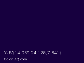 YUV 14.059,24.128,7.841 Color is a very dark violet color and the nearest color is Tolopea #1b0245. Hex code #17003f and RGB value is rgb(23,-0,63). In RGB color space, this color is composed of 9% red, 0% green, 25% blue, In CMYK color space, this color is composed of 63% cyan, 100% magenta, 0% yellow , 75% black , In HSL color space, this color has a hue angle of 262° , 100% saturation and 12% lightness.