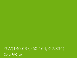 YUV 140.037,-60.164,-22.834 Color is a normal green color and the nearest color is Lima #76bd17. Hex code #72b112 and RGB value is rgb(114,177,18). In RGB color space, this color is composed of 45% red, 69% green, 7% blue, In CMYK color space, this color is composed of 36% cyan, 0% magenta, 90% yellow , 31% black , In HSL color space, this color has a hue angle of 84° , 82% saturation and 38% lightness.