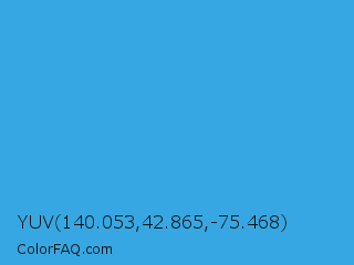 YUV 140.053,42.865,-75.468 Color is a normal blue color and the nearest color is Picton Blue #45b1e8. Hex code #36a7e3 and RGB value is rgb(54,167,227). In RGB color space, this color is composed of 21% red, 65% green, 89% blue, In CMYK color space, this color is composed of 76% cyan, 26% magenta, 0% yellow , 11% black , In HSL color space, this color has a hue angle of 201° , 76% saturation and 55% lightness.