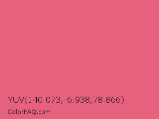 YUV 140.073,-6.938,78.866 Color is a light red color and the nearest color is Blush #de5d83. Hex code #e6617e and RGB value is rgb(230,97,126). In RGB color space, this color is composed of 90% red, 38% green, 49% blue, In CMYK color space, this color is composed of 0% cyan, 58% magenta, 45% yellow , 10% black , In HSL color space, this color has a hue angle of 347° , 73% saturation and 64% lightness.
