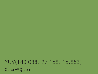 YUV 140.088,-27.158,-15.863 Color is a normal green color and the nearest color is Asparagus Green #7ba05b. Hex code #7aa055 and RGB value is rgb(122,160,85). In RGB color space, this color is composed of 48% red, 63% green, 33% blue, In CMYK color space, this color is composed of 24% cyan, 0% magenta, 47% yellow , 37% black , In HSL color space, this color has a hue angle of 90° , 31% saturation and 48% lightness.