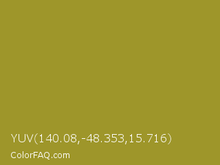 YUV 140.08,-48.353,15.716 Color is a normal yellow color and the nearest color is Luxor Gold #a7882c. Hex code #9e962a and RGB value is rgb(158,150,42). In RGB color space, this color is composed of 62% red, 59% green, 16% blue, In CMYK color space, this color is composed of 0% cyan, 5% magenta, 73% yellow , 38% black , In HSL color space, this color has a hue angle of 56° , 58% saturation and 39% lightness.