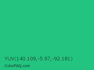 YUV 140.109,-5.97,-92.181 Color is a normal green color and the nearest color is Mountain Meadow Crayola #1ab385. Hex code #23c480 and RGB value is rgb(35,196,128). In RGB color space, this color is composed of 14% red, 77% green, 50% blue, In CMYK color space, this color is composed of 82% cyan, 0% magenta, 35% yellow , 23% black , In HSL color space, this color has a hue angle of 155° , 70% saturation and 45% lightness.
