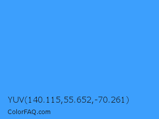YUV 140.115,55.652,-70.261 Color is a light blue color and the nearest color is Brilliant Azure #3399ff. Hex code #3c9ffd and RGB value is rgb(60,159,253). In RGB color space, this color is composed of 24% red, 62% green, 99% blue, In CMYK color space, this color is composed of 76% cyan, 37% magenta, 0% yellow , 1% black , In HSL color space, this color has a hue angle of 209° , 98% saturation and 61% lightness.