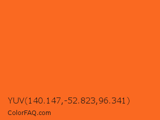 YUV 140.147,-52.823,96.341 Color is a normal orange color and the nearest color is Orange #ff681f. Hex code #fa6921 and RGB value is rgb(250,105,33). In RGB color space, this color is composed of 98% red, 41% green, 13% blue, In CMYK color space, this color is composed of 0% cyan, 58% magenta, 87% yellow , 2% black , In HSL color space, this color has a hue angle of 20° , 96% saturation and 55% lightness.