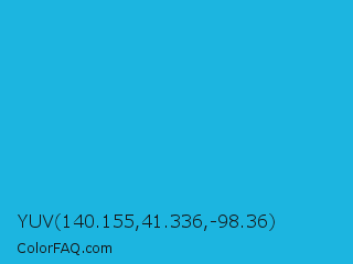 YUV 140.155,41.336,-98.36 Color is a normal cyan color and the nearest color is Battery Charged Blue #1dacd6. Hex code #1cb5e0 and RGB value is rgb(28,181,224). In RGB color space, this color is composed of 11% red, 71% green, 88% blue, In CMYK color space, this color is composed of 88% cyan, 19% magenta, 0% yellow , 12% black , In HSL color space, this color has a hue angle of 193° , 78% saturation and 49% lightness.