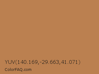 YUV 140.169,-29.663,41.071 Color is a normal orange color and the nearest color is Deer #ba8759. Hex code #bb8050 and RGB value is rgb(187,128,80). In RGB color space, this color is composed of 73% red, 50% green, 31% blue, In CMYK color space, this color is composed of 0% cyan, 32% magenta, 57% yellow , 27% black , In HSL color space, this color has a hue angle of 27° , 44% saturation and 52% lightness.
