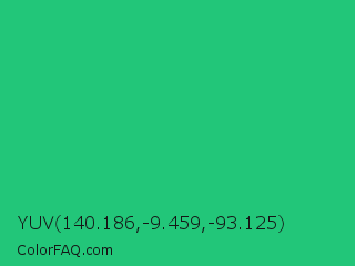 YUV 140.186,-9.459,-93.125 Color is a normal green color and the nearest color is Mountain Meadow Crayola #1ab385. Hex code #22c679 and RGB value is rgb(34,198,121). In RGB color space, this color is composed of 13% red, 78% green, 47% blue, In CMYK color space, this color is composed of 83% cyan, 0% magenta, 39% yellow , 22% black , In HSL color space, this color has a hue angle of 152° , 71% saturation and 45% lightness.