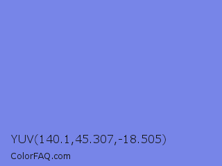 YUV 140.1,45.307,-18.505 Color is a light blue color and the nearest color is Chetwode Blue #8581d9. Hex code #7785e8 and RGB value is rgb(119,133,232). In RGB color space, this color is composed of 47% red, 52% green, 91% blue, In CMYK color space, this color is composed of 49% cyan, 43% magenta, 0% yellow , 9% black , In HSL color space, this color has a hue angle of 233° , 71% saturation and 69% lightness.