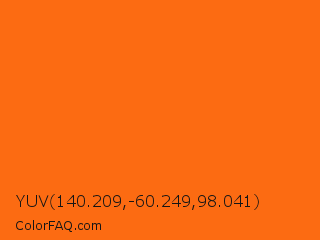 YUV 140.209,-60.249,98.041 Color is a normal orange color and the nearest color is Pumpkin #ff7518. Hex code #fc6b12 and RGB value is rgb(252,107,18). In RGB color space, this color is composed of 99% red, 42% green, 7% blue, In CMYK color space, this color is composed of 0% cyan, 58% magenta, 93% yellow , 1% black , In HSL color space, this color has a hue angle of 23° , 98% saturation and 53% lightness.