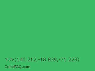 YUV 140.212,-18.839,-71.223 Color is a normal green color and the nearest color is Medium Sea Green #3cb371. Hex code #3bbd66 and RGB value is rgb(59,189,102). In RGB color space, this color is composed of 23% red, 74% green, 40% blue, In CMYK color space, this color is composed of 69% cyan, 0% magenta, 46% yellow , 26% black , In HSL color space, this color has a hue angle of 140° , 52% saturation and 49% lightness.