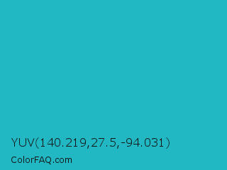 YUV 140.219,27.5,-94.031 Color is a normal cyan color and the nearest color is Java #1fc2c2. Hex code #21b8c4 and RGB value is rgb(33,184,196). In RGB color space, this color is composed of 13% red, 72% green, 77% blue, In CMYK color space, this color is composed of 83% cyan, 6% magenta, 0% yellow , 23% black , In HSL color space, this color has a hue angle of 184° , 71% saturation and 45% lightness.