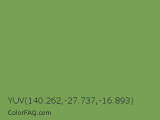YUV 140.262,-27.737,-16.893 Color is a normal green color and the nearest color is Asparagus Green #7ba05b. Hex code #79a154 and RGB value is rgb(121,161,84). In RGB color space, this color is composed of 47% red, 63% green, 33% blue, In CMYK color space, this color is composed of 25% cyan, 0% magenta, 48% yellow , 37% black , In HSL color space, this color has a hue angle of 91° , 31% saturation and 48% lightness.