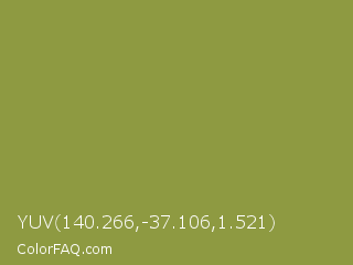 YUV 140.266,-37.106,1.521 Color is a normal yellow color and the nearest color is Sycamore #908d39. Hex code #8e9a41 and RGB value is rgb(142,154,65). In RGB color space, this color is composed of 56% red, 60% green, 25% blue, In CMYK color space, this color is composed of 8% cyan, 0% magenta, 58% yellow , 40% black , In HSL color space, this color has a hue angle of 68° , 41% saturation and 43% lightness.
