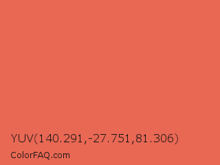 YUV 140.291,-27.751,81.306 Color is a light red color and the nearest color is Burnt Sienna #e97451. Hex code #e96854 and RGB value is rgb(233,104,84). In RGB color space, this color is composed of 91% red, 41% green, 33% blue, In CMYK color space, this color is composed of 0% cyan, 55% magenta, 64% yellow , 9% black , In HSL color space, this color has a hue angle of 8° , 77% saturation and 62% lightness.