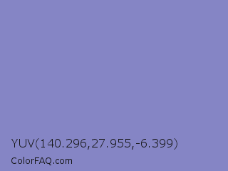 YUV 140.296,27.955,-6.399 Color is a light blue color and the nearest color is Ube #8878c3. Hex code #8585c5 and RGB value is rgb(133,133,197). In RGB color space, this color is composed of 52% red, 52% green, 77% blue, In CMYK color space, this color is composed of 32% cyan, 32% magenta, 0% yellow , 23% black , In HSL color space, this color has a hue angle of 240° , 36% saturation and 65% lightness.