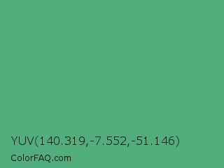 YUV 140.319,-7.552,-51.146 Color is a normal green color and the nearest color is Shiny Shamrock #5fa778. Hex code #52ad7d and RGB value is rgb(82,173,125). In RGB color space, this color is composed of 32% red, 68% green, 49% blue, In CMYK color space, this color is composed of 53% cyan, 0% magenta, 28% yellow , 32% black , In HSL color space, this color has a hue angle of 148° , 36% saturation and 50% lightness.
