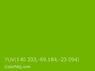 YUV 140.333,-69.184,-23.094 Color is a normal green color and the nearest color is Limeade #6f9d02. Hex code #72b500 and RGB value is rgb(114,181,-0). In RGB color space, this color is composed of 45% red, 71% green, 0% blue, In CMYK color space, this color is composed of 37% cyan, 0% magenta, 100% yellow , 29% black , In HSL color space, this color has a hue angle of 82° , 100% saturation and 35% lightness.