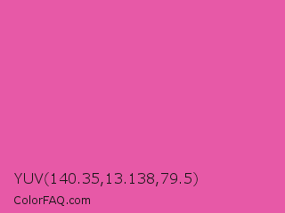 YUV 140.35,13.138,79.5 Color is a light magenta color and the nearest color is Brilliant Rose #f653a6. Hex code #e759a7 and RGB value is rgb(231,89,167). In RGB color space, this color is composed of 91% red, 35% green, 65% blue, In CMYK color space, this color is composed of 0% cyan, 61% magenta, 28% yellow , 9% black , In HSL color space, this color has a hue angle of 327° , 75% saturation and 63% lightness.