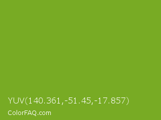 YUV 140.361,-51.45,-17.857 Color is a normal green color and the nearest color is Lima #76bd17. Hex code #78ab24 and RGB value is rgb(120,171,36). In RGB color space, this color is composed of 47% red, 67% green, 14% blue, In CMYK color space, this color is composed of 30% cyan, 0% magenta, 79% yellow , 33% black , In HSL color space, this color has a hue angle of 83° , 65% saturation and 41% lightness.