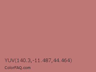 YUV 140.3,-11.487,44.464 Color is a normal red color and the nearest color is Rose Gold #b76e79. Hex code #bf7775 and RGB value is rgb(191,119,117). In RGB color space, this color is composed of 75% red, 47% green, 46% blue, In CMYK color space, this color is composed of 0% cyan, 38% magenta, 39% yellow , 25% black , In HSL color space, this color has a hue angle of 2° , 37% saturation and 60% lightness.