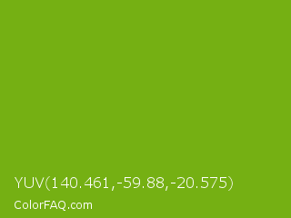 YUV 140.461,-59.88,-20.575 Color is a normal green color and the nearest color is Lima #76bd17. Hex code #75b013 and RGB value is rgb(117,176,19). In RGB color space, this color is composed of 46% red, 69% green, 7% blue, In CMYK color space, this color is composed of 34% cyan, 0% magenta, 89% yellow , 31% black , In HSL color space, this color has a hue angle of 83° , 81% saturation and 38% lightness.