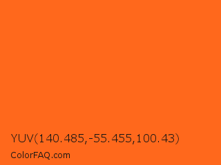 YUV 140.485,-55.455,100.43 Color is a normal orange color and the nearest color is Orange #ff681f. Hex code #ff681c and RGB value is rgb(255,104,28). In RGB color space, this color is composed of 100% red, 41% green, 11% blue, In CMYK color space, this color is composed of 0% cyan, 59% magenta, 89% yellow , 0% black , In HSL color space, this color has a hue angle of 20° , 100% saturation and 55% lightness.
