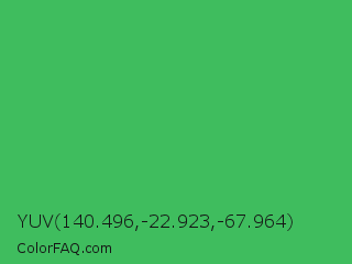 YUV 140.496,-22.923,-67.964 Color is a normal green color and the nearest color is Chateau Green #40a860. Hex code #3fbd5e and RGB value is rgb(63,189,94). In RGB color space, this color is composed of 25% red, 74% green, 37% blue, In CMYK color space, this color is composed of 67% cyan, 0% magenta, 50% yellow , 26% black , In HSL color space, this color has a hue angle of 135° , 50% saturation and 49% lightness.
