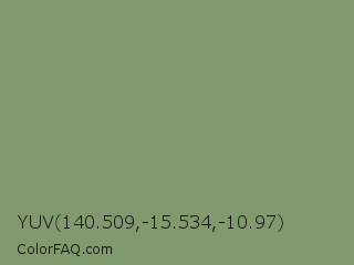 YUV 140.509,-15.534,-10.97 Color is a normal green color and the nearest color is Battleship Gray #828f72. Hex code #80996d and RGB value is rgb(128,153,109). In RGB color space, this color is composed of 50% red, 60% green, 43% blue, In CMYK color space, this color is composed of 16% cyan, 0% magenta, 29% yellow , 40% black , In HSL color space, this color has a hue angle of 94° , 18% saturation and 51% lightness.