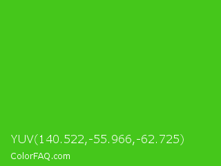 YUV 140.522,-55.966,-62.725 Color is a normal green color and the nearest color is Harlequin Green #46cb18. Hex code #45c71b and RGB value is rgb(69,199,27). In RGB color space, this color is composed of 27% red, 78% green, 11% blue, In CMYK color space, this color is composed of 65% cyan, 0% magenta, 86% yellow , 22% black , In HSL color space, this color has a hue angle of 105° , 76% saturation and 44% lightness.