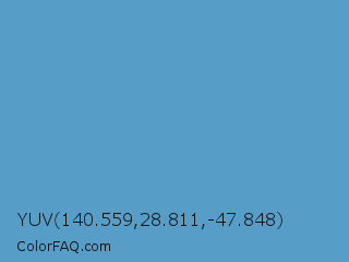YUV 140.559,28.811,-47.848 Color is a normal blue color and the nearest color is Carolina Blue #56a0d3. Hex code #569dc7 and RGB value is rgb(86,157,199). In RGB color space, this color is composed of 34% red, 62% green, 78% blue, In CMYK color space, this color is composed of 57% cyan, 21% magenta, 0% yellow , 22% black , In HSL color space, this color has a hue angle of 202° , 50% saturation and 56% lightness.