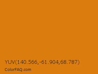 YUV 140.566,-61.904,68.787 Color is a normal orange color and the nearest color is Meteor #d07d12. Hex code #db7d0f and RGB value is rgb(219,125,15). In RGB color space, this color is composed of 86% red, 49% green, 6% blue, In CMYK color space, this color is composed of 0% cyan, 43% magenta, 93% yellow , 14% black , In HSL color space, this color has a hue angle of 32° , 87% saturation and 46% lightness.