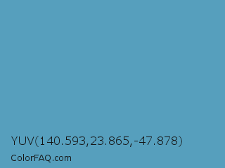 YUV 140.593,23.865,-47.878 Color is a normal blue color and the nearest color is Hippie Blue #589aaf. Hex code #569fbd and RGB value is rgb(86,159,189). In RGB color space, this color is composed of 34% red, 62% green, 74% blue, In CMYK color space, this color is composed of 54% cyan, 16% magenta, 0% yellow , 26% black , In HSL color space, this color has a hue angle of 197° , 44% saturation and 54% lightness.