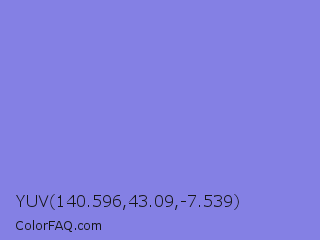 YUV 140.596,43.09,-7.539 Color is a light indigo color and the nearest color is Chetwode Blue #8581d9. Hex code #8480e4 and RGB value is rgb(132,128,228). In RGB color space, this color is composed of 52% red, 50% green, 89% blue, In CMYK color space, this color is composed of 42% cyan, 44% magenta, 0% yellow , 11% black , In HSL color space, this color has a hue angle of 242° , 65% saturation and 70% lightness.