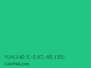 YUV 140.5,-5.67,-95.155 Color is a normal green color and the nearest color is Mountain Meadow Crayola #1ab385. Hex code #20c681 and RGB value is rgb(32,198,129). In RGB color space, this color is composed of 13% red, 78% green, 51% blue, In CMYK color space, this color is composed of 84% cyan, 0% magenta, 35% yellow , 22% black , In HSL color space, this color has a hue angle of 155° , 72% saturation and 45% lightness.