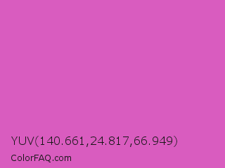 YUV 140.661,24.817,66.949 Color is a light magenta color and the nearest color is Fuchsia Pink #c154c1. Hex code #d95cbf and RGB value is rgb(217,92,191). In RGB color space, this color is composed of 85% red, 36% green, 75% blue, In CMYK color space, this color is composed of 0% cyan, 58% magenta, 12% yellow , 15% black , In HSL color space, this color has a hue angle of 312° , 62% saturation and 61% lightness.