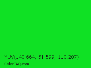 YUV 140.664,-51.599,-110.207 Color is a normal green color and the nearest color is Vivid Malachite #00cc33. Hex code #0fe124 and RGB value is rgb(15,225,36). In RGB color space, this color is composed of 6% red, 88% green, 14% blue, In CMYK color space, this color is composed of 93% cyan, 0% magenta, 84% yellow , 12% black , In HSL color space, this color has a hue angle of 126° , 88% saturation and 47% lightness.