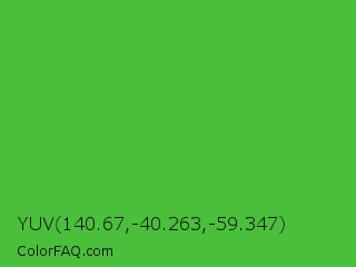 YUV 140.67,-40.263,-59.347 Color is a normal green color and the nearest color is Apple #4fa83d. Hex code #49bf3b and RGB value is rgb(73,191,59). In RGB color space, this color is composed of 29% red, 75% green, 23% blue, In CMYK color space, this color is composed of 62% cyan, 0% magenta, 69% yellow , 25% black , In HSL color space, this color has a hue angle of 114° , 53% saturation and 49% lightness.