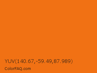 YUV 140.67,-59.49,87.989 Color is a normal orange color and the nearest color is Ecstasy #fa7814. Hex code #f17114 and RGB value is rgb(241,113,20). In RGB color space, this color is composed of 95% red, 44% green, 8% blue, In CMYK color space, this color is composed of 0% cyan, 53% magenta, 92% yellow , 5% black , In HSL color space, this color has a hue angle of 25° , 89% saturation and 51% lightness.