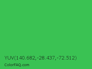 YUV 140.682,-28.437,-72.512 Color is a normal green color and the nearest color is Chateau Green #40a860. Hex code #3ac253 and RGB value is rgb(58,194,83). In RGB color space, this color is composed of 23% red, 76% green, 33% blue, In CMYK color space, this color is composed of 70% cyan, 0% magenta, 57% yellow , 24% black , In HSL color space, this color has a hue angle of 131° , 54% saturation and 49% lightness.