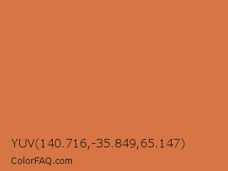YUV 140.716,-35.849,65.147 Color is a normal orange color and the nearest color is Raw Sienna Crayola #d27d46. Hex code #d77544 and RGB value is rgb(215,117,68). In RGB color space, this color is composed of 84% red, 46% green, 27% blue, In CMYK color space, this color is composed of 0% cyan, 46% magenta, 68% yellow , 16% black , In HSL color space, this color has a hue angle of 20° , 65% saturation and 55% lightness.
