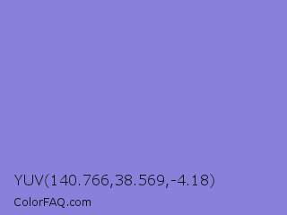 YUV 140.766,38.569,-4.18 Color is a light indigo color and the nearest color is Chetwode Blue #8581d9. Hex code #8880db and RGB value is rgb(136,128,219). In RGB color space, this color is composed of 53% red, 50% green, 86% blue, In CMYK color space, this color is composed of 38% cyan, 42% magenta, 0% yellow , 14% black , In HSL color space, this color has a hue angle of 245° , 56% saturation and 68% lightness.
